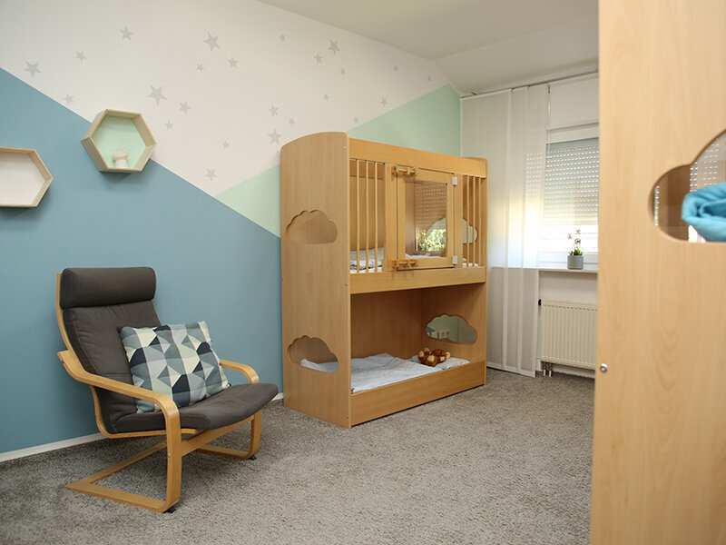Jedes Kind hat sein eigenes kleines Bett, das individuell mit einem Kuscheltier oder einem vertrauen Gegenstand gemütlich eingerichtet werden kann. Sanfte Musik, abgedunkeltes Licht und eine vertraute Atmosphäre helfen dabei, zur Ruhe zu finden und in den Schlaf zu gleiten. Eine Fachkraft begleitet die Kinder dabei liebevoll und sorgt für Geborgenheit.